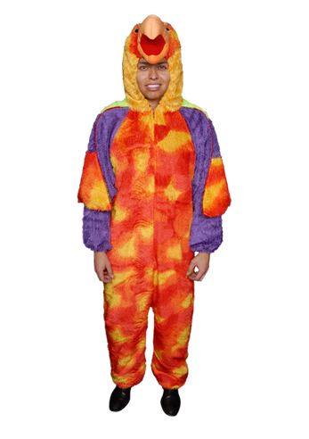 Parrot Jumpsuit Unisex Adults Costume - This costume includes Plush Jumpsuit with attached Head, Colorful jumpsuit has attached wings at the shoulder, Head has an orange beak with a red mouth, Furry costume is sweet and cuddly, Available in kids sizing, Set packaged in durable snap sealed poly bag, Gentle Machine Washable Flame Retardant. .