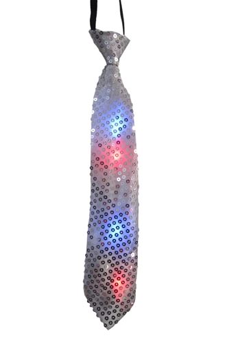 Silver Tie With Flashing Lights - This product includes necktie has 6 LED bulbs in 3 Colors and batteries. 3 LED flashing options: Steady flashing, on an off quick, on and off slow. This sequined necktie makes a great accessory for your costume. Switch on the lights to add some excitement to your get up. Light up, fashionable ties that will draw tons of attention.