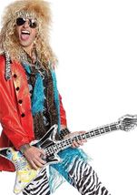 Inflatable Guitar Black - This Package Includes One inflatable guitar. This costume accessory features silver inflatable guitar with red and orange flames rising along the base printed on a black and blue background..