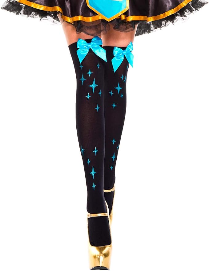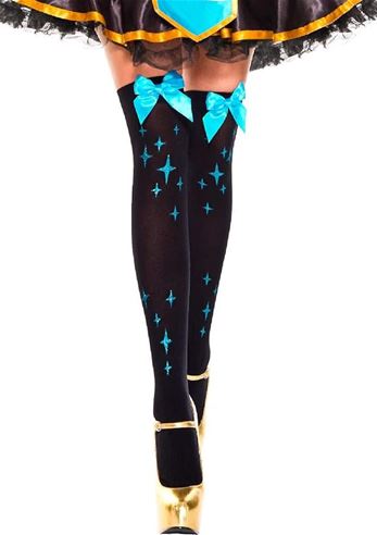 Star Print Satin Bow Thigh High Black Turquoise - Star print thigh-high stockings in black and turquoise with a satin bow accent, featuring a soft, stretchy, and eye-catching fit—perfect for costumes, parties, and bold fashion looks. It does not include Shoes and Skirt..