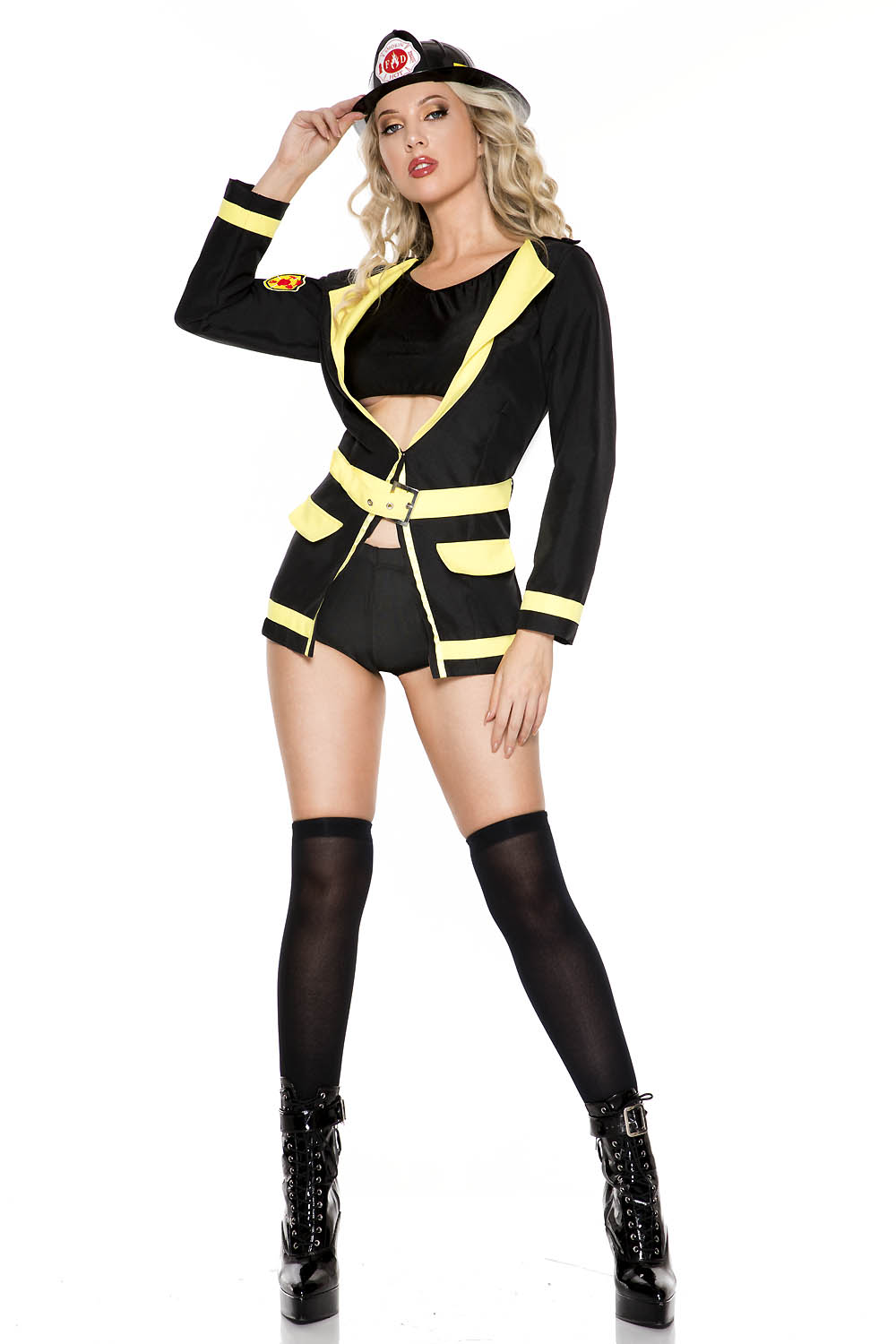 Hazardous Fire Chief Women Costume - This Women 5 PC. costume includes: Crop top, stretch booty shorts, collar vest with yellow trims and pockets, hat, and belt. It does not include Shoes and Thigh hi..