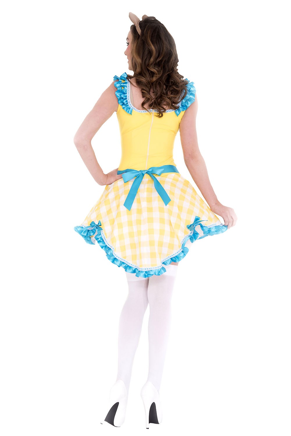 Glistening Goldy Women Costume - This costume includes Puffy dress with attached apron and bow, bear ears . This is made of polyester. Does not includes chain, thigh highs and shoes.