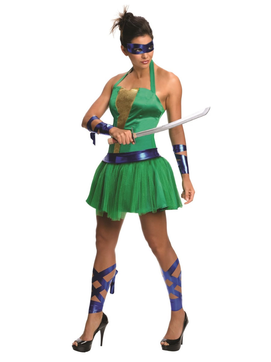 Leonardo Ninja Turtle Women Costume - This Costume includes Dress, belt, 2 arm ties, 2 leg ties, eyemask and Stuffable Shell. This is a Licensed costume of Ninja Turtle. Does not include sword and shoes..