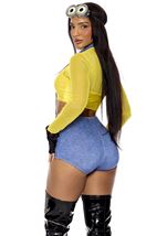 Boo Yah Women Costume - Boo Yah Women movie character costume features mockneck crop top with sheer mesh panels and halterneck romper and fingerless gloves and Eyes goggle headband. Tie Closure. Fabric Content 87% Polyester 13% Spandex. Model is 5ft 4in and wearing a size S/M. It does not include Shoes..