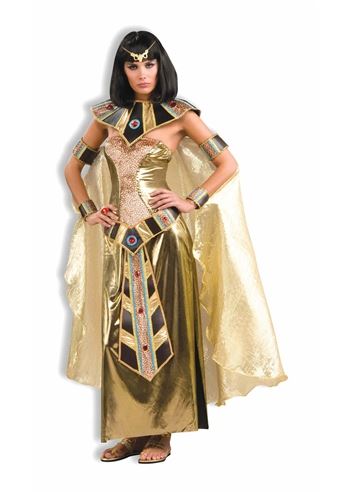 Egyptian Goddess Woman Costume - This product includes cape with attached neck piece, shiny gold sequin dress with jewel accents in the belt, arm bands, and wrist bands. Head piece, wig and shoes not included. .