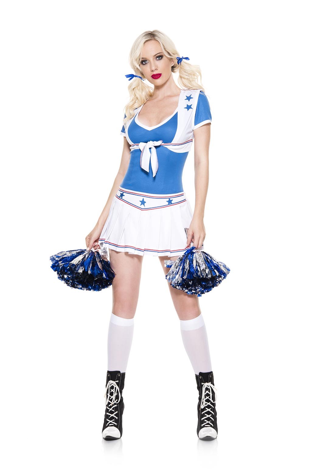 Spirit Cheerleader Women Costume - This Costume includes Pleated star print skirt, blue top, matching vest, ties, and pom poms. It does not include Shoes and Socks.