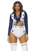 Seeing Stars Cheerleader Women Costume - This costume includes cheerleader metallic foiled collared tie-top paired with star embroidered fringe vest along with matching panty and belt. Model is 5ft 8in and wearing a size XS/S. Fabric Content 90% Polyester 10% Spandex. Top Tie Closure. Shorts Snap Button Closure. Belt Buckle Closure. Thigh highs and Shoes not included..