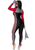 Shift Gear Racer Woman Costume - This product includes mockneck zipfront long sleeve jumpsuit with embroidered patches and lace-up side detail paired with checkerprint gloves and glasses. Does not include Shoes, Flag .