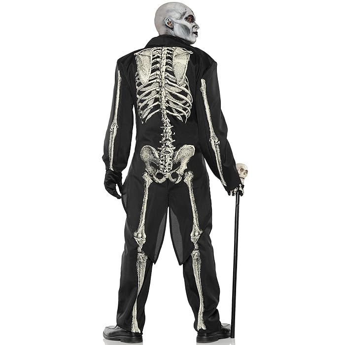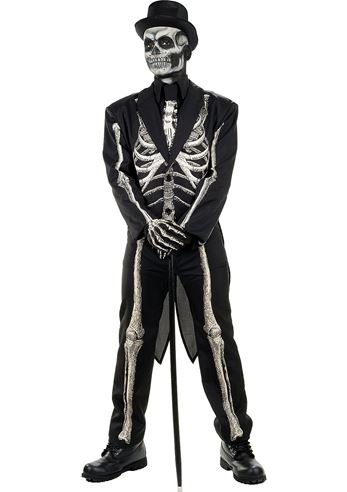 Bone Chillin Skeleton Men Costume - This costume features a printed skeleton for a unique and eye catching design. It includes a black suit with a tuxedo jacket with tails, faux shirtfront with tie, pants and gloves. Does not include shoes, makeup, hat and cane.