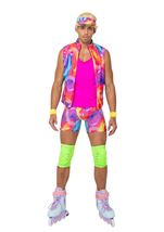 Retro Rollerblade Stud Men Costume - This costume includes zip up vest, tank top, shorts, sweatbands, visor, and kneepads. Does not include shoes roller. The Retro Rollerblade Stud Men Costume is a vibrant and energetic ensemble that allows you to embrace the retro rollerblading culture of the 80s. With its colorful vest, matching shorts, and attention to detail, this costume is sure to make you stand out in any 80s-themed event or party. Get ready to roll back in time and show off your rollerblading moves with confidence and style.