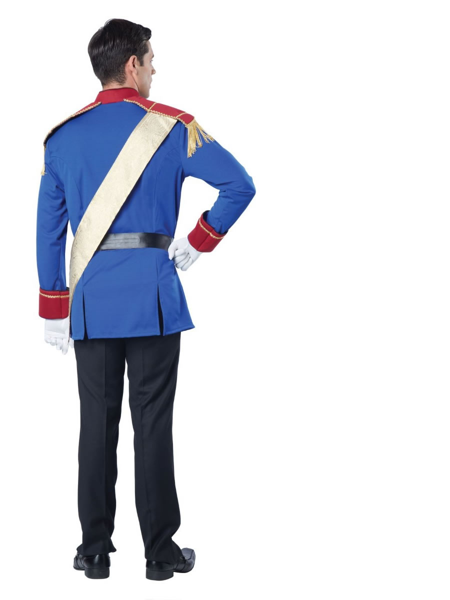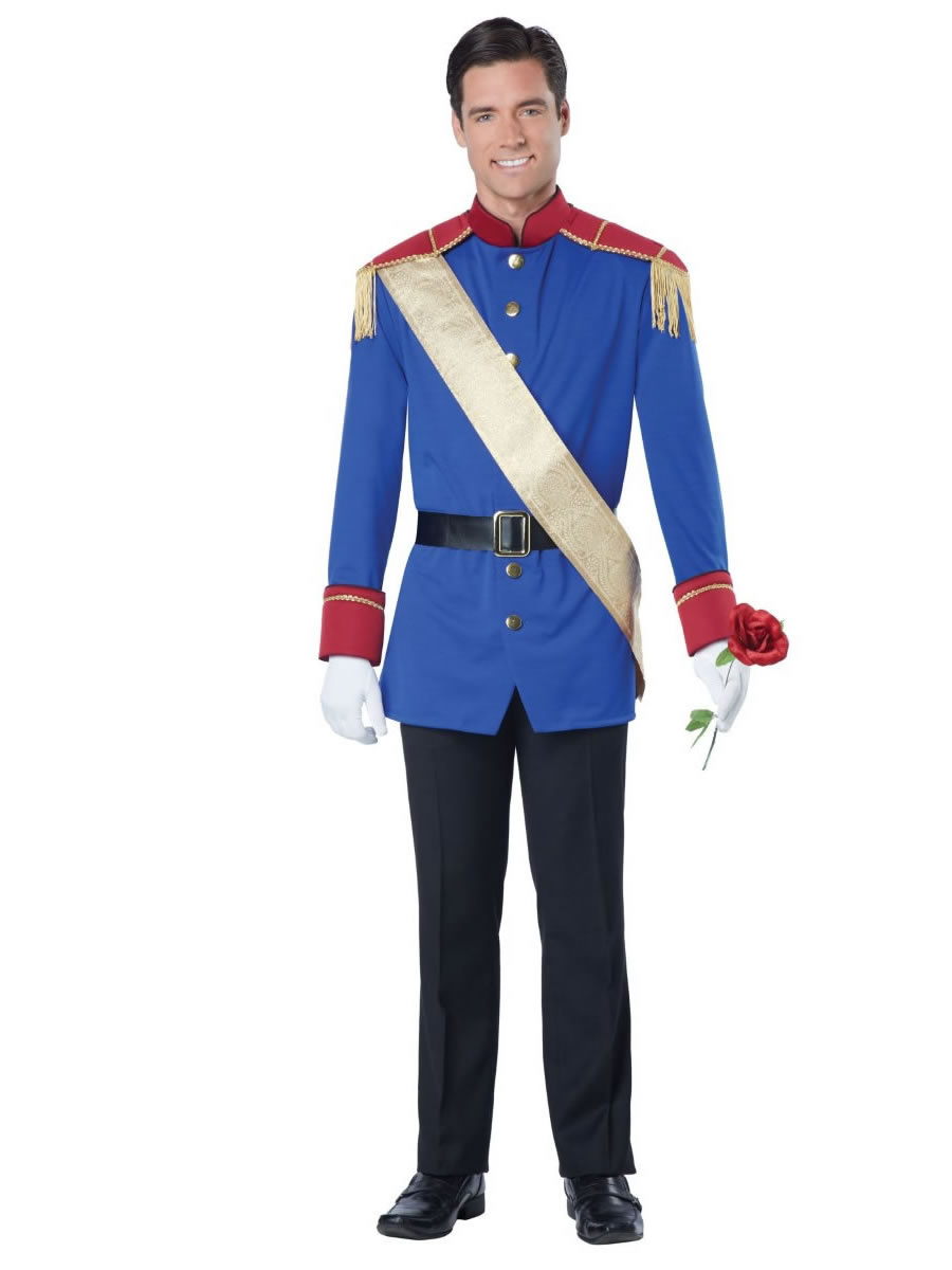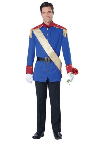 Storybook Prince Men Costume - The perfect man is straight out of a fairy tale. The charming Storybook prince costume comes with a button up jacket with attached shoulder epaulets, a sash and a belt with buckle. Not included: gloves, pants, rose, and shoes.