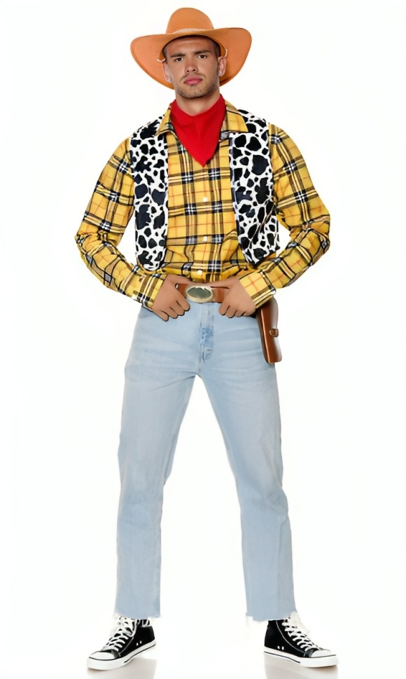Playtime Deputy Cowboy Story Men Costume - This costume costume features poplin button down plaid long sleeve collared shirt paired with contrast cowprint vest and solid bandana and faux leather belt with holster. Fabric Content: 90% Polyester 10% Spandex. Hat, Jeans and Footwear are not included..