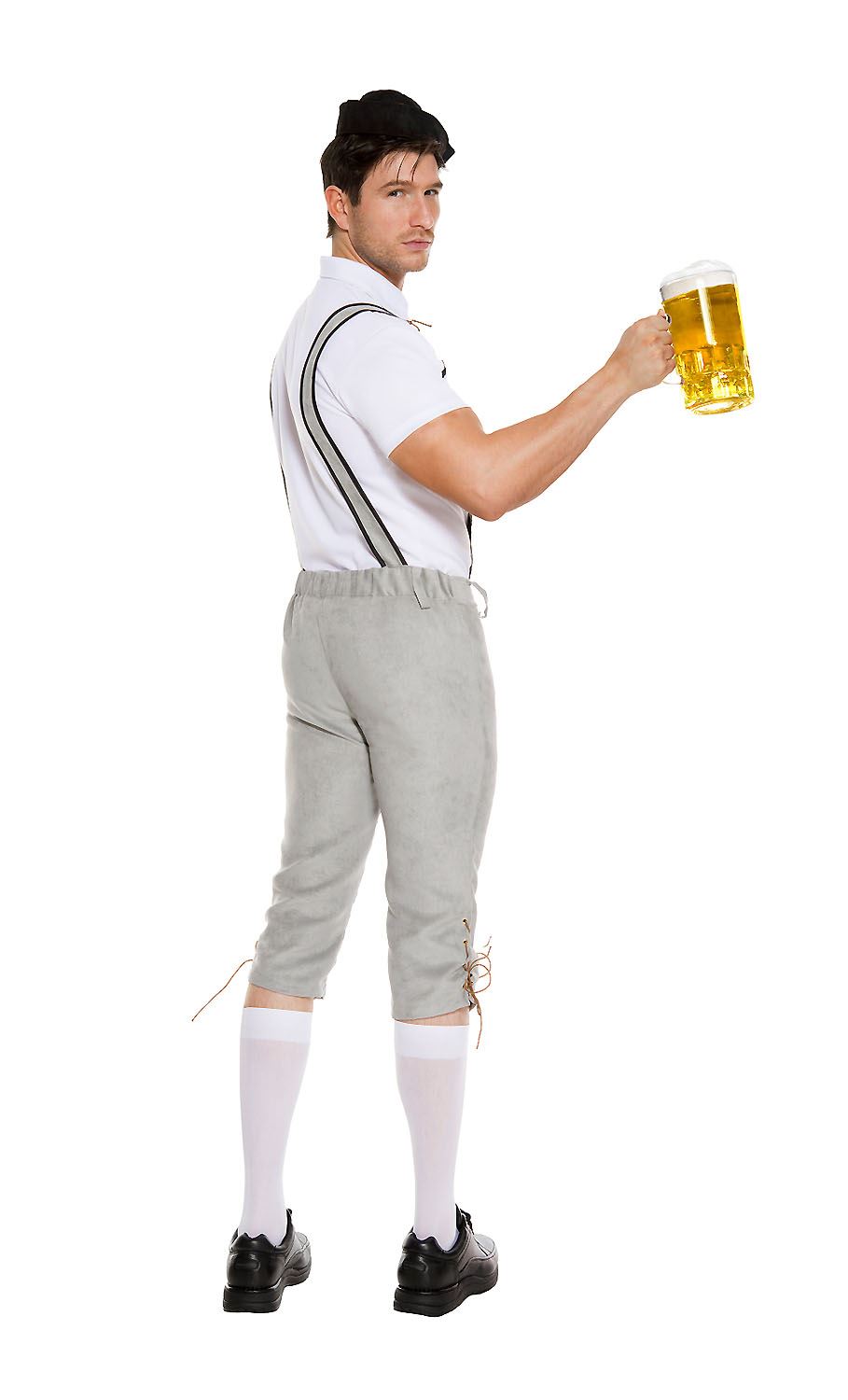 German Beer Men Costume Gray - This costume includes Lace up collared shirt and alpine region printed trousers with H-shaped suspenders hat. This is made of polyester. Does not includes beer mug, socks and shoes.