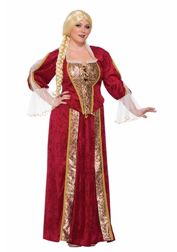 Renaissance Queen Woman Plus Costume - Full fit favorite. This product includes flaring long sleeve corset style top with lace up front with decorative gold lace accent and long skirt. Does not include wig and headpiece. Unique outfit for Medieval theme parties to make an entry as Royal queen.