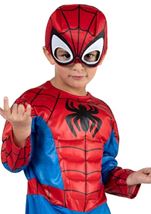 Spidey Red And Blue Toddler Spider Man Costume - Look out: here comes the Spidey Toddler Costume. This muscle chest jumpsuit will transform your kid into the iconic web head. Its cut from poly jersey and stuffed with poly fill around the arms and chest to show off Spideys strong physique. Costume also includes a fabric Spidey mask to help conceal your kids secret identity. Does not include shoes.