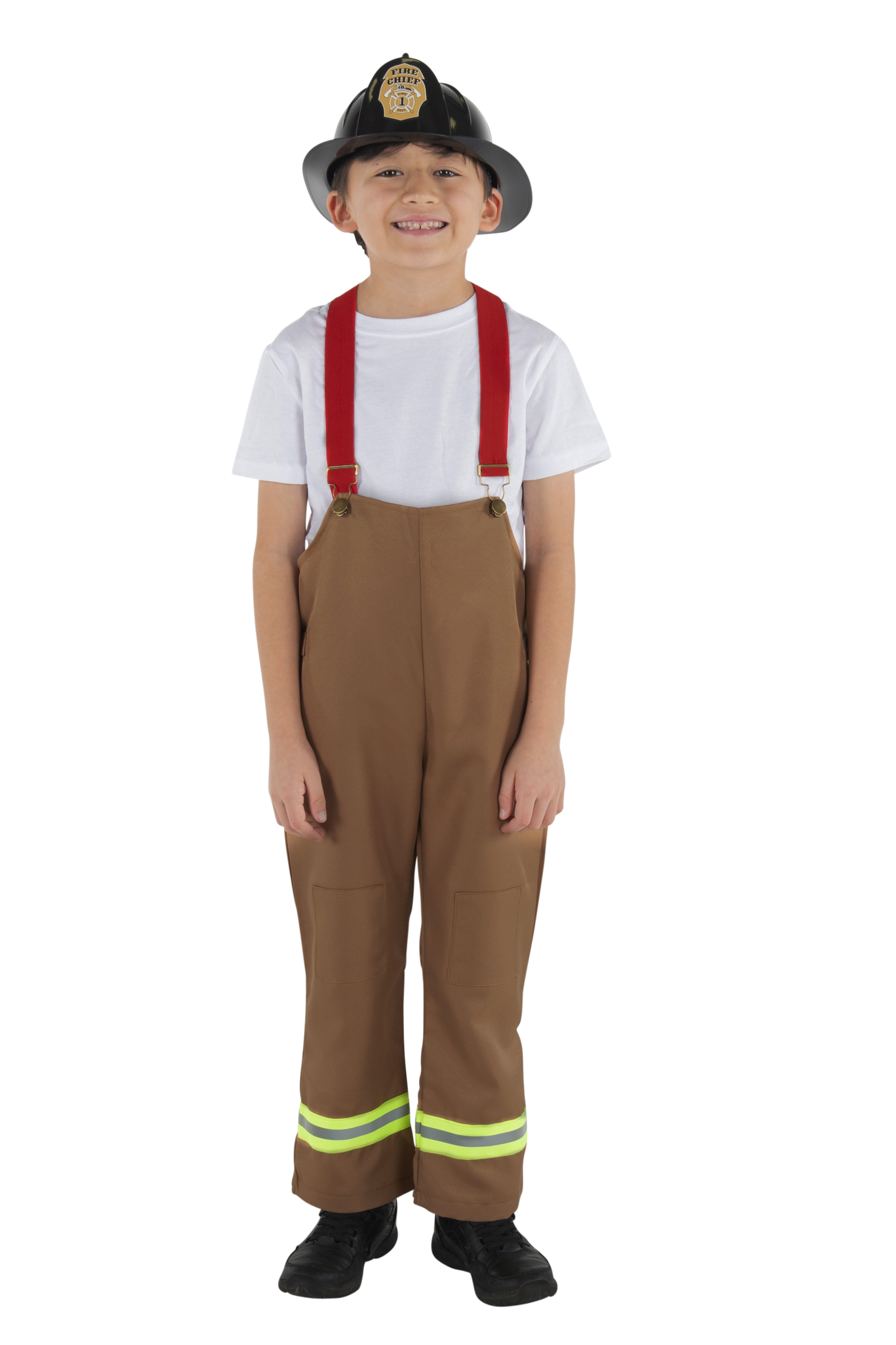 Brown Fire Fighter Boys Costume - The Adorable fireman dress up set includes a helmet, tan jacket and pants with attached red suspenders. Perfect for any boy or girl who dreams of being a firefighter one day. This firefighter set will look like the real deal. Quality polyester materials with embroidered reflective straps, real pockets with a zipper and toggle closure. While wearing his fireman uniform, stimulate fire drills and let him experience the things that real fireman need to do to save the day in an emergency. The fire awareness and the social responsibility of your little one can be strengthened in fun ways. Does not include shoes.