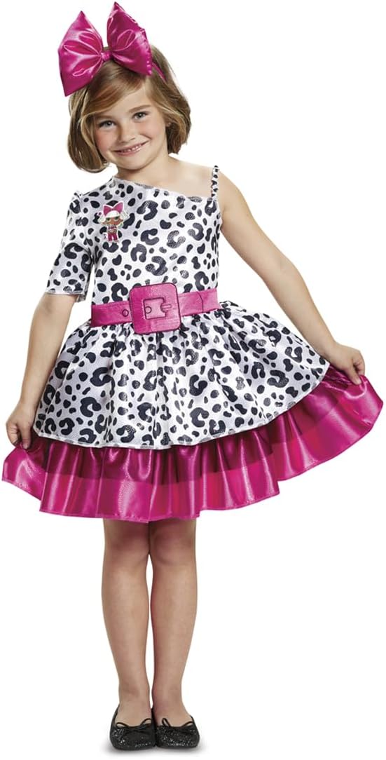 Diva Girls LOL Surprise Costume - Officially licensed LOL Surprise Diva Girls costume featuring a satin knee-length dress with silver foil dots, layered glitter tulle skirt, and matching headpiece. Perfect for Halloween, dress-up, and themed parties. It does not include shoes..