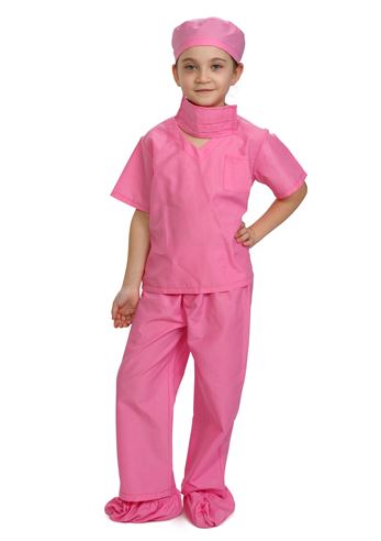 Pink Doctor Scrubs Girls Costume - This costume includes Shirt, Pants, Cap, Surgical Mask, Shoe Covers, Short sleeved V-neck pink, shirt has a pocket in the front and Velcro closure in the back, Pants and shoe covers feature an elastic band for comfortable fit, Mask and Cap top off the costume, Also available in Blue and Pink, Set is packaged in a deluxe zipper sealed garment bag for easy carrying and storage..