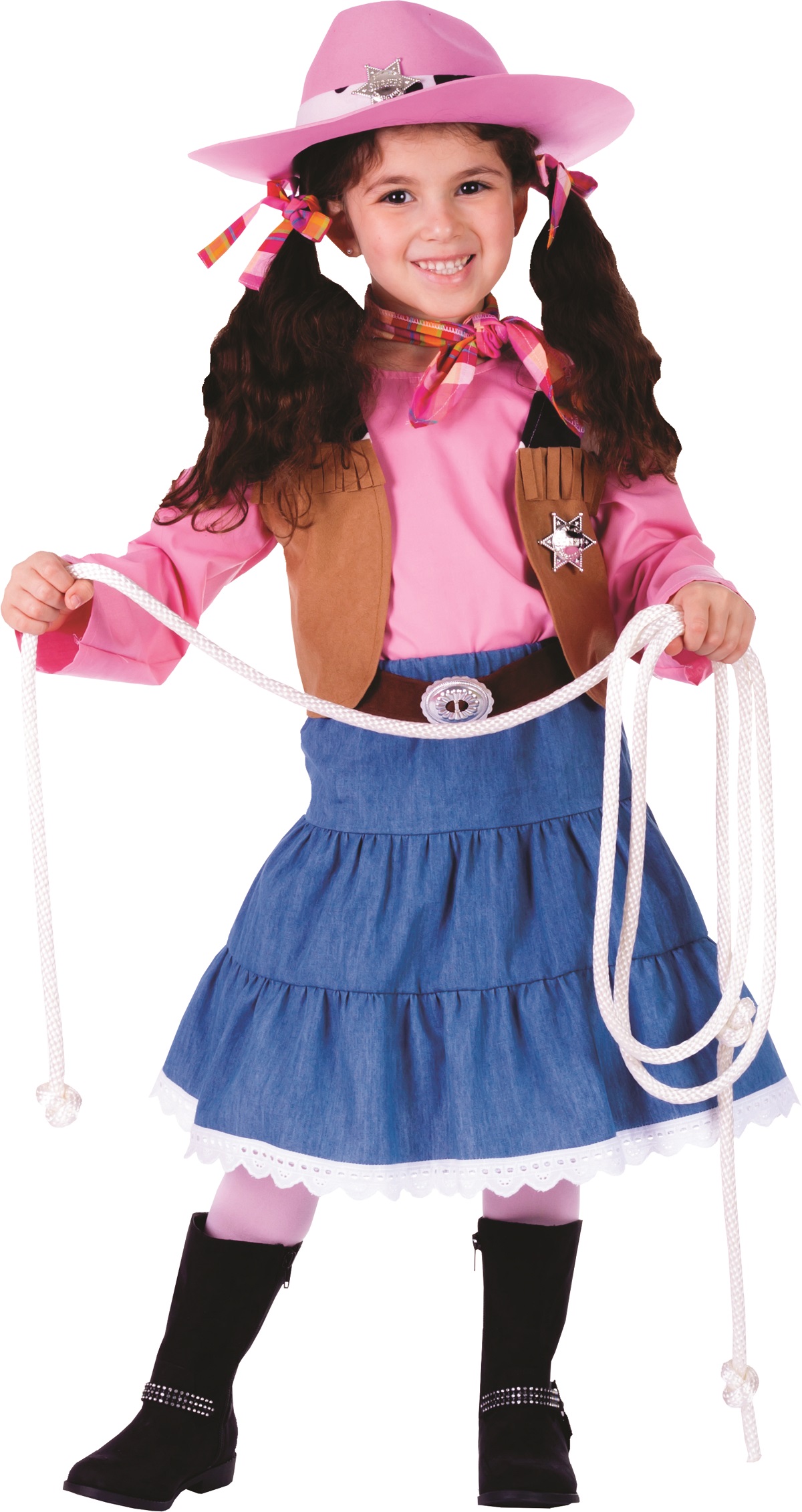 Junior Cowgirl Girls Costume - This costume includes Shirt, Vest, Skirt, Belt, Scarf and 2 Hair Bows, Pink top has a Velcro closure in the back, Tan and cow printed vest faux suede has a silver sheriff badge, Denim 3 tiered skirt has an elastic waist and a cute white lace trim at the bottom, Add the plaid neck scarf and hair bows for the girly touch, Set packaged in a durable zippered garment bag..